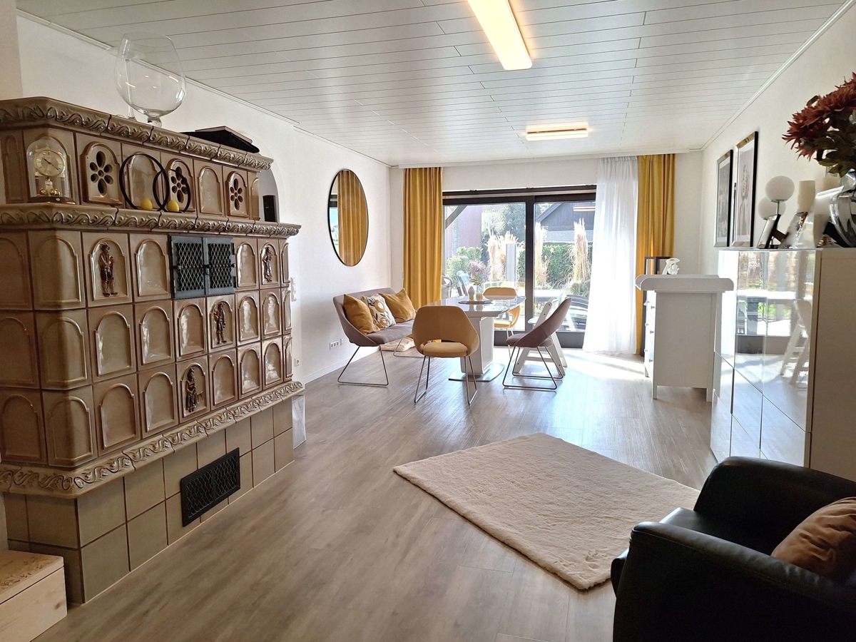 Im Erdgeschoss schafft das großzügige Wohnzimmer auf ca. 37 m² stimmungsvolles Wohnambiente. Der gasbetriebene Kachelofen und die breite Schiebtürelemente zur Terrasse untermalen diesen hellen und zugleich gemütlichen Raum.