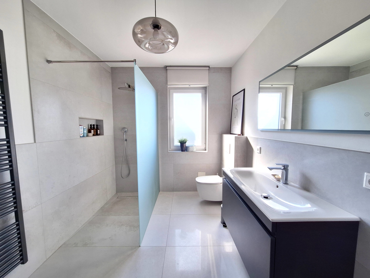 Das Badezimmer im Obergeschoss glänzt nun im edlen Design. Die bodengleiche Dusche mit ca. 1,60 m überbreiter Glasabtrennung harmoniert wundervoll mit den stilvollen Fliesen, die sich auch im schicken Gäste-WC des Erdgeschosses wiederfinden.