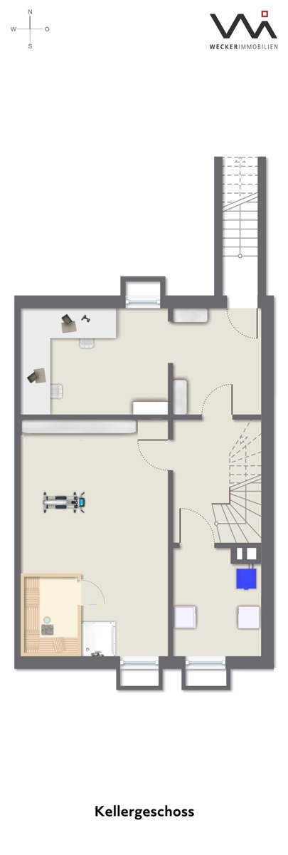 Das Haus ist vollunterkellert. Hier befindet sich ein riesiger Hobbyraum, der mit einer Sauna und Dusche ausgestattet wurde. Handwerker können sich zudem auf ihren eigenen Werkraum freuen. Vor der Kelleraußentreppe befindet sich ein zusätzlicher Lagerraum.