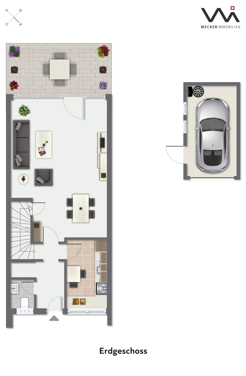 Im Erdgeschoss empfängt Sie ein heller, einladender Eingangsbereich mit Garderobe – optimal für einen angenehmen Empfang nach einem langen Tag. Gleich gegenüber befindet sich die Küche, praktisch gelegen am großzügigen Wohnbereich. Das Gäste-WC komplettiert den Hauseingang.
