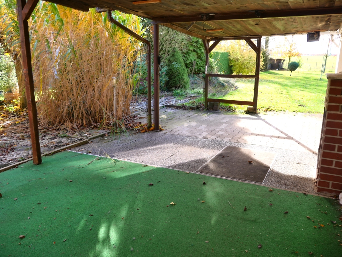 Dort befindet sich die großzügige, überdachte Terrasse. Das Abdach ist funktional, könnte aber optisch ein modernes Update vertragen.