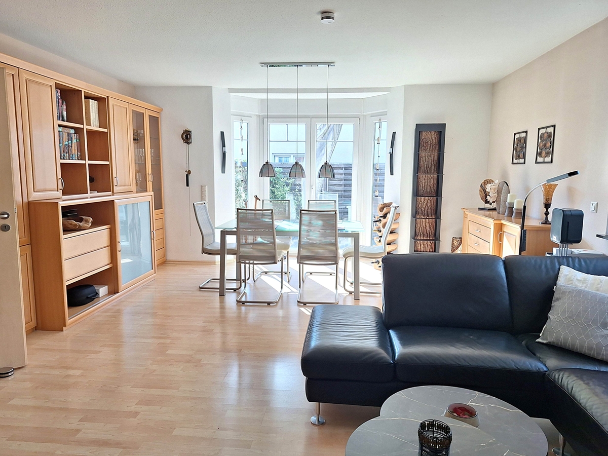 Der helle Wohn- und Essbereich lädt sofort zum Verweilen ein. Große Fenster durchfluten den Raum mit Tageslicht und schaffen eine wundervolle Atmosphäre. Der Esstisch steht perfekt vor dem hellen Erker, um gemeinsam schöne Stunden mit Familie und Freunden zu genießen.