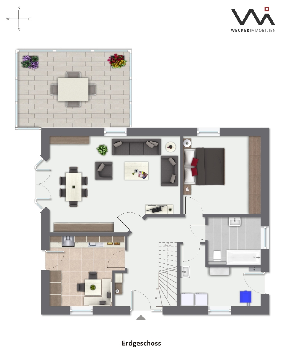 Die Küche bietet nicht nur viel Platz für kulinarische Abenteuer, sondern auch direkten Zugang zur sonnigen Westterrasse – ideal, um den Tag mit einem Kaffee in der Abendsonne ausklingen zu lassen. Das Gäste- oder Arbeitszimmer im Erdgeschoss bietet Ihnen zusätzliche Flexibilität – ob als Rückzugsort, kreativer Raum oder gemütliches Zimmer für Ihre Gäste.