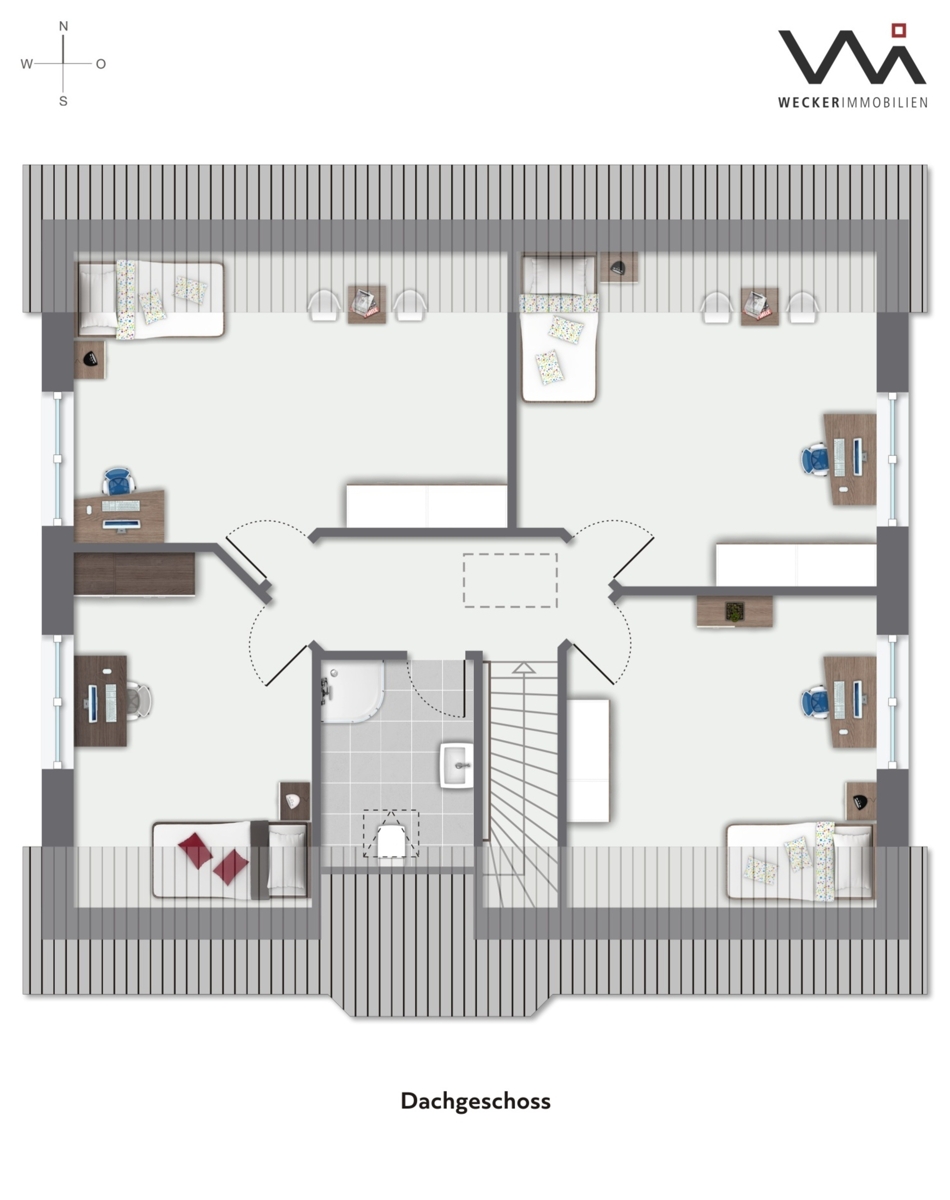Oben ist Platz für Träume. Im Dachgeschoss eröffnet sich Ihnen ein wunderbares Raumangebot: Die vier großen Zimmer bieten viele Möglichkeiten – als Schlafzimmer, Kinderzimmer, Hobbyraum oder Homeoffice. Das Duschbad sorgt für zusätzlichen Komfort am Morgen. Der komplett begehbare Dachboden bietet Stauraum und Platz für all die Dinge, die das Leben bereichern.