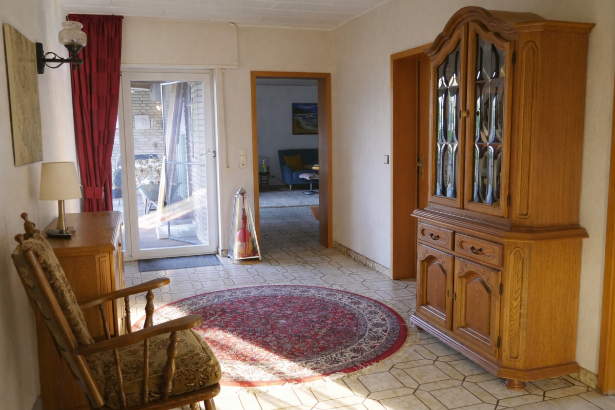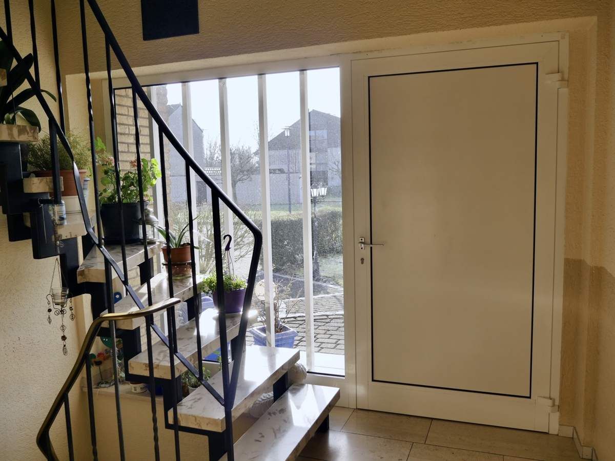 Wir beginnen unsere Besichtigung am Hauseingang. Nach dem Betreten des Hauses empfängt Sie ein kleiner, einladender Eingangsbereich mit Treppenhaus. Durch eine separate Glastür gelangen Sie in die zentral gelegene Diele, von der aus sich sämtliche Räume des Erdgeschosses erschließen.