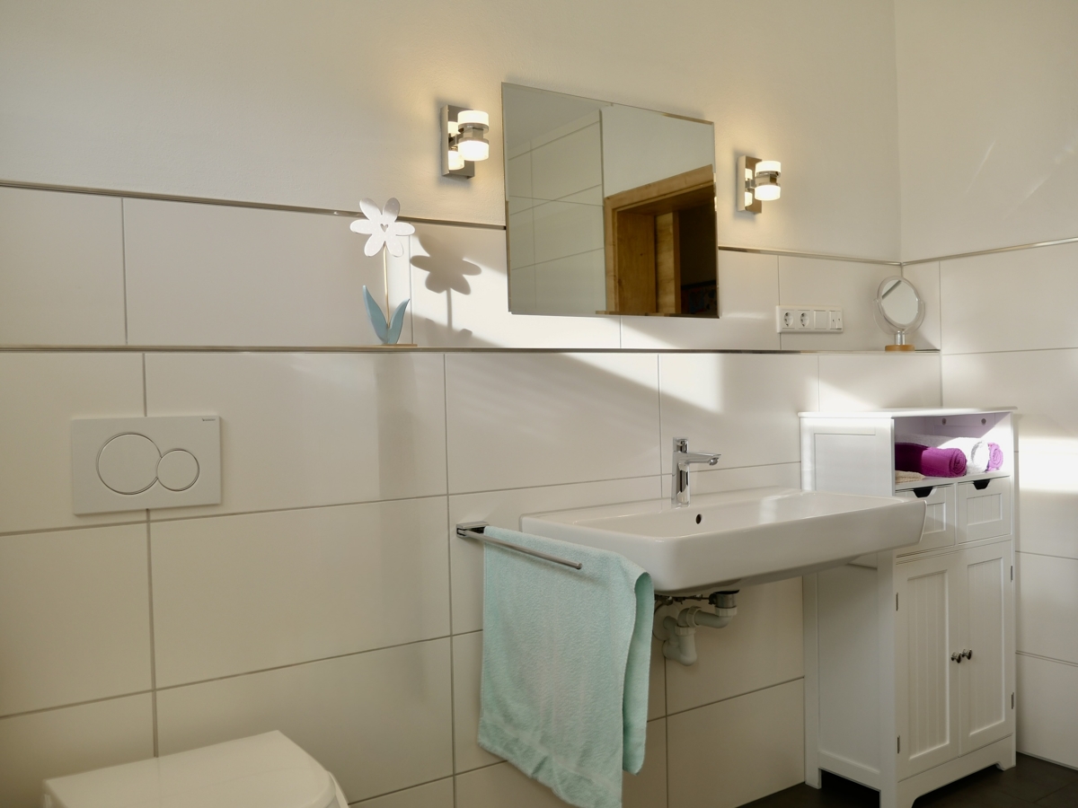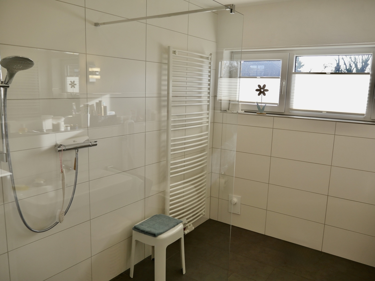 Das modernisierte Badezimmer, das im Jahr 2020 barrierearm umgestaltet wurde, präsentiert sich zeitlos und hochwertig. Die bodengleiche, einseitig begehbare Dusche ist durch eine Glasscheibe abgetrennt. Ein grauer Bodenbelag in Kombination mit schlichten, weißen Wandfliesen verleiht dem Raum eine ruhige und harmonische Atmosphäre – ein Ort zum Wohlfühlen.
