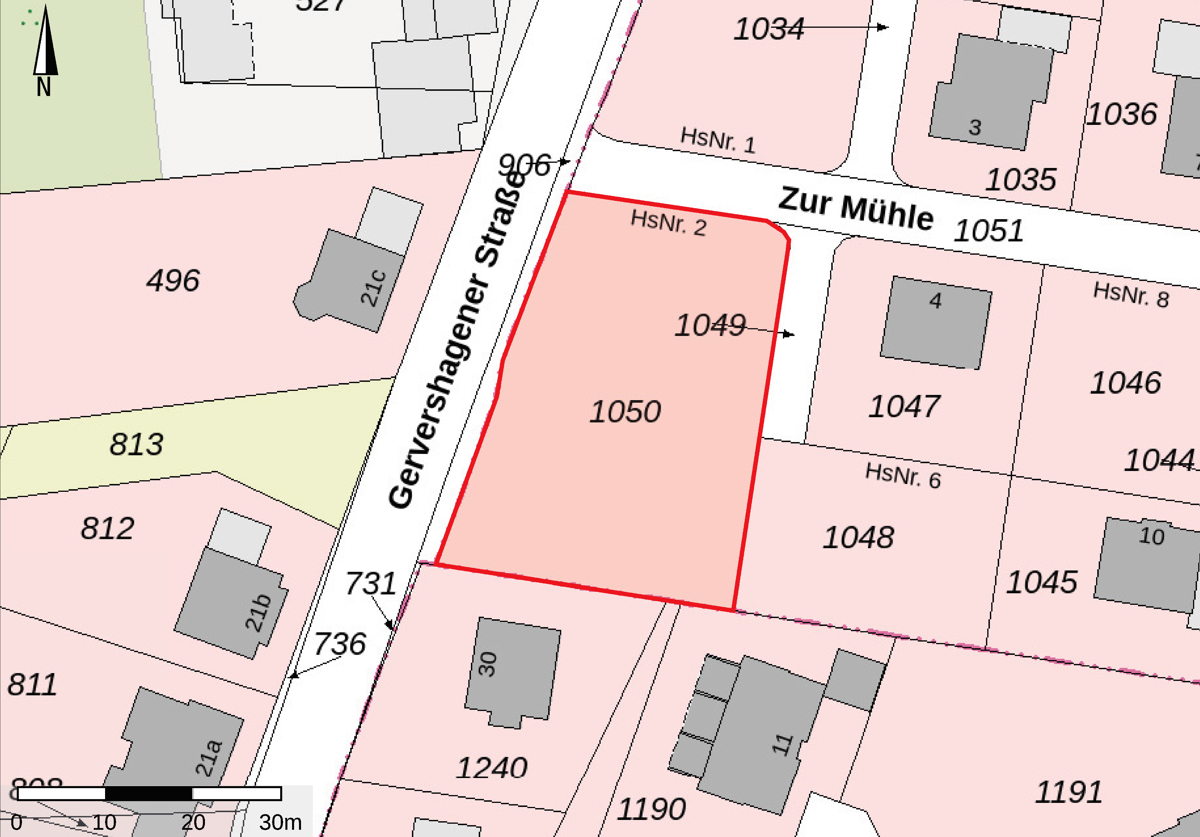 Das Grundstück hat eine Fläche von ca. 1.346 m². Hinzu kommt ein halber Anteil (ca. 63 m²) am Privatweg des Flurstücks 1049 mit einer Fläche von ca. 126 m². Insgesamt beträgt die Grundstücksfläche 1.409 m². Das Grundstück kann individuell, unter Einhaltung des Bebauungsplanes, beplant und bebaut werden. Zudem kann das Grundstück auch in zwei Grundstücke aufgeteilt werden - sofern der Bau eines Doppelhauses geplant wird. Zu beachten ist, dass das Baugrundstück für eine Doppelhaushälfte die Mindestgröße von 240 m² nicht unterschreiten darf. Nach dem jetzigen Stand kann auch ein Mehrfamilienhaus mit 10 Wohneinheiten gebaut werden. Eine Baugenehmigung liegt vor und kann übernommen werden (Betrag nicht im Kaufpreis enthalten).