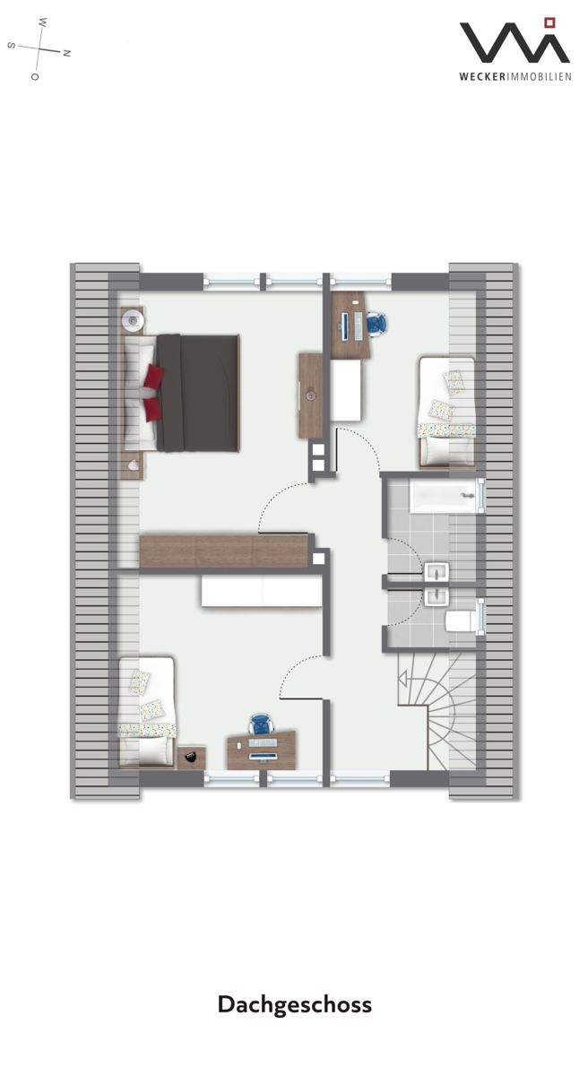 Das Dachgeschoss stellt mit drei Schlafzimmern, seinem Wannenbad und dem separaten WC einen komfortablen Grundriss für die Familie. Mit dem wohnlich ausgebauten Spitzboden haben Sie eine weitere Möglichkeit, einen gemütlichen Rückzugsort zu schaffen oder zusätzlich zum Vollkeller Fläche für all die Dinge zu nutzen, die eine Familie täglich braucht.