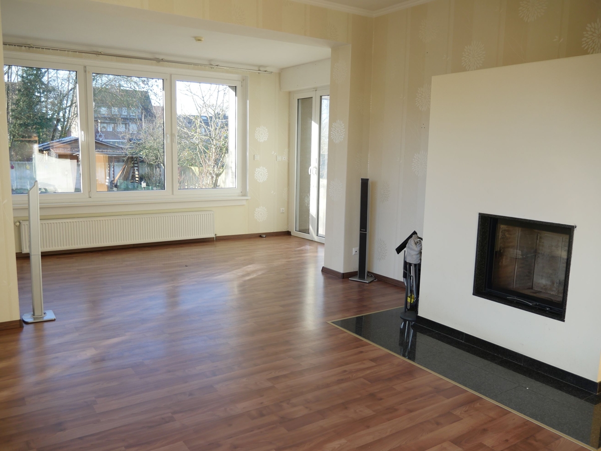 Beim Betreten des Hauses werden Sie von einem kleinen Flur empfangen, der Platz für einen Schuhschrank bietet und Sie direkt in den größeren Flur mit Garderobe führt. Hier haben Sie viel Platz zum Ankommen. Daneben befindet sich das helle und große Wohnzimmer, das durch seinen gemütlichen Kamin und die breite Fensterfront mit Ausblick in den tollen Garten besticht. Es ist der perfekte Raum für behagliches Beisammensein.