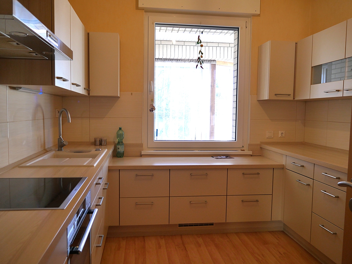 Neben dem Wohnzimmer liegt die wertige, vollausgestattete Küche. Praktischerweise gibt es im Erdgeschoss ein Duschbad, das für den schnellen Start in den Tag sorgt.