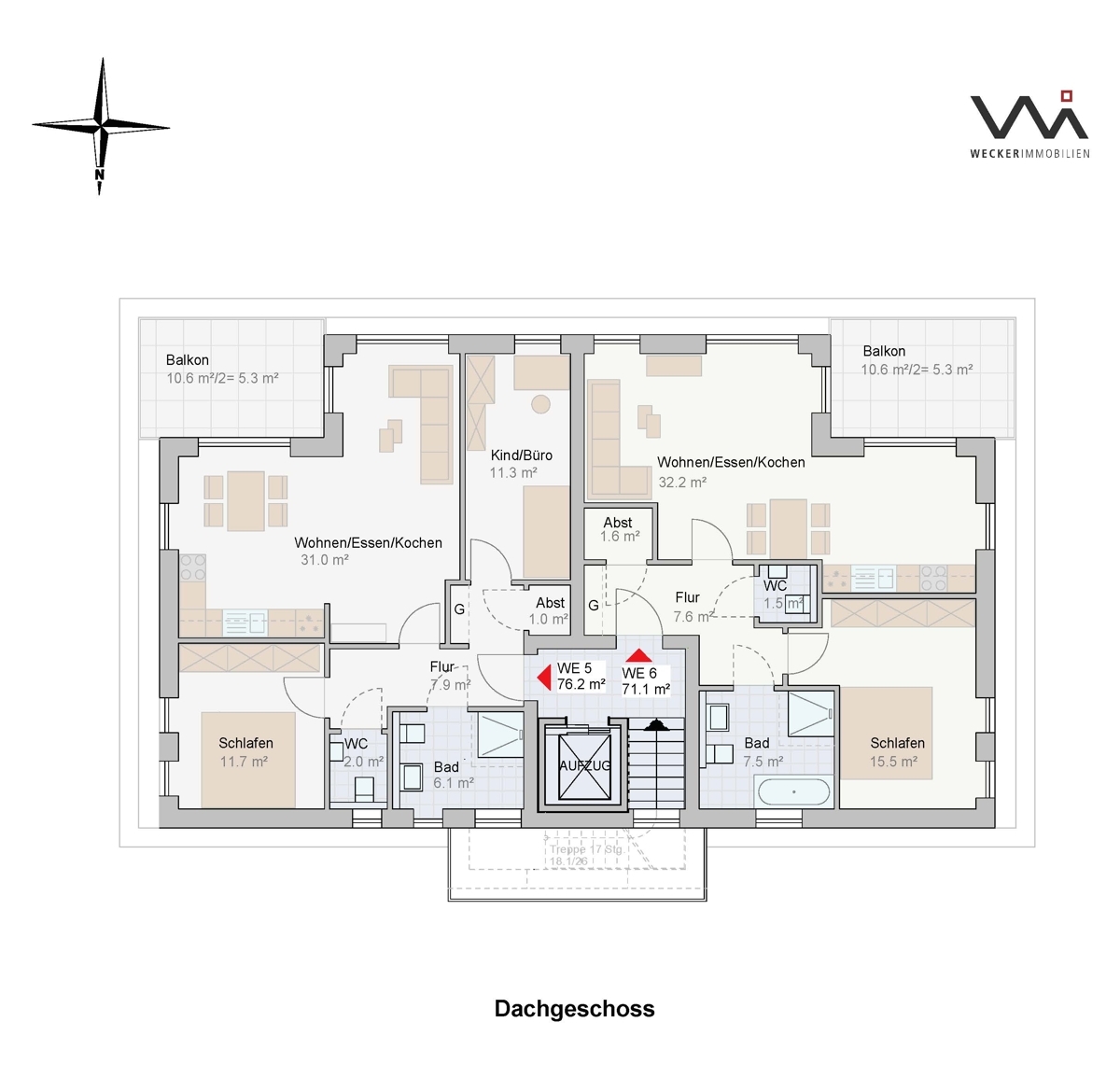 In diesem Exposé ist beispielhaft im Haus 2 die Zweizimmerwohnung Nr. 6 im Dachgeschoss beschrieben (siehe Grundriss Wohnung Nr. 6). Freuen Sie sich auf einen attraktiven Grundriss mit ca. 71,20 m² Wohnfläche inklusive Balkon.