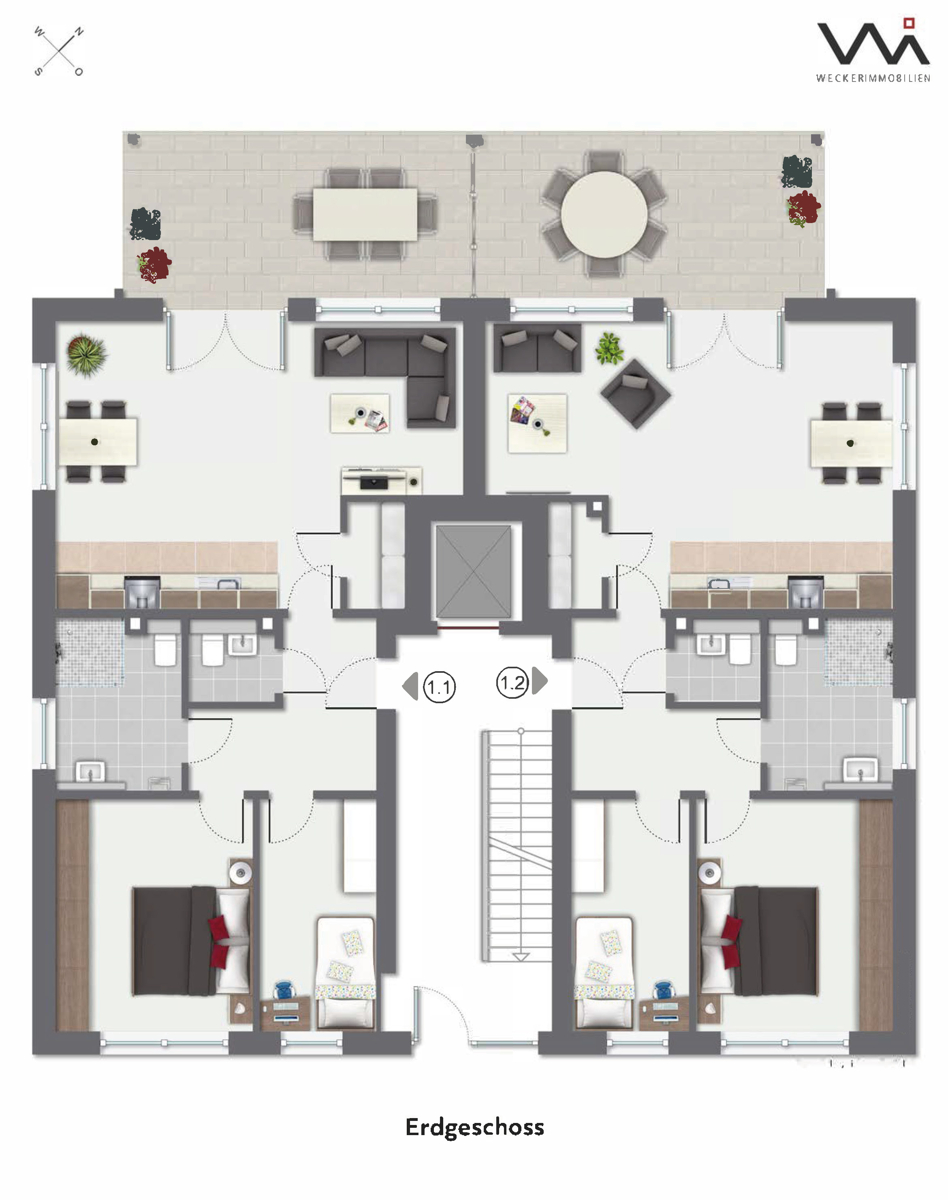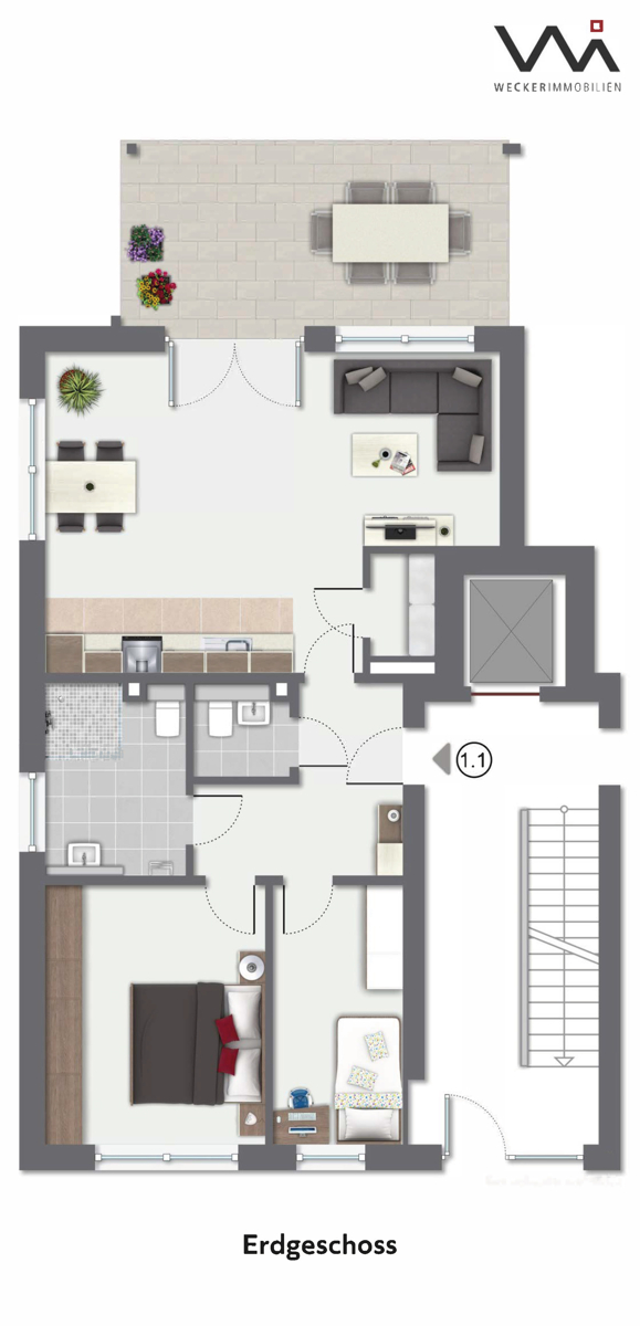 In diesem Exposé ist beispielhaft die Dreizimmerwohnung Nr. 1 im Erdgeschoss beschrieben (siehe Grundriss Wohnung Nr. 1.1).