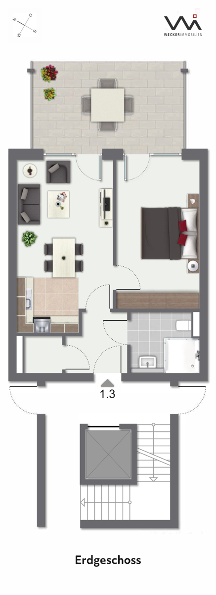 In diesem Exposé ist beispielhaft die Zweizimmerwohnung Nr. 3 im Erdgeschoss beschrieben (siehe Grundriss Wohnung Nr. 1.3).