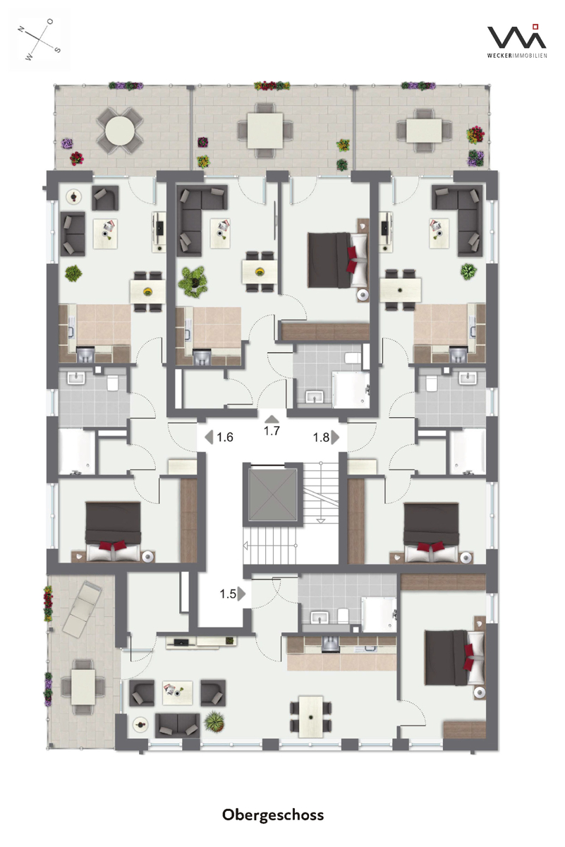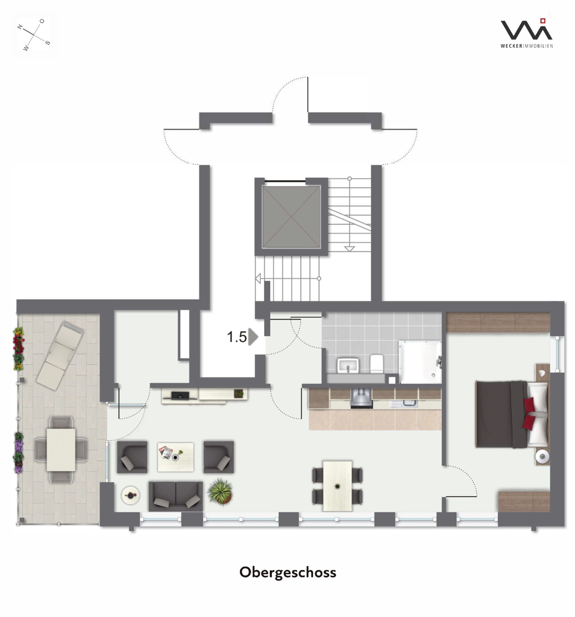 In diesem Exposé ist beispielhaft die Zweizimmerwohnung Nr. 5 im Obergeschoss beschrieben (siehe Grundriss Wohnung Nr. 1.5).